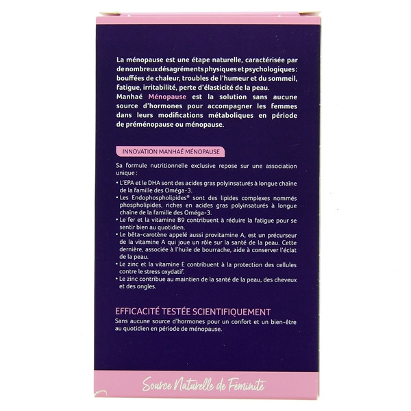 Le complément alimentaire de la marque Manhaé est une solution nutritionnelle destinée à calmer les désagréments dus à la ménopause. La vitamine B9 et le fer présents dans ce complément alimentaire réduisent les sensations de fatigue passagère. Le bêta-carotène agit favorablement sur la peau en conservant sa douceur et son éclat. L'association du zinc et de la vitamine E permet à ce complément alimentaire de protéger les cellules des effets nocifs du stress oxydatif, principal facteur du vieillissement. Le complément alimentaire de la marque Manhaé bénéficie d'une formule sans hormone et sans soja.