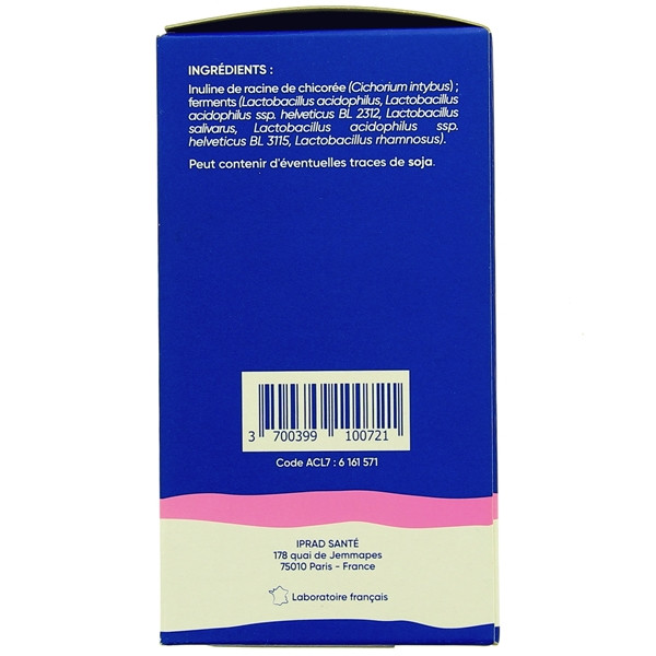 Inuline de racine de chicorée (Cichorium Intybus), Ferments (Lactobacillus Acidophilus, Lactobacillus Acidophilus ssp. Helveticus BL 2312, Lactobacillus Salivarus, Lactobacillus Acidophilus ssp. Helveticus BL 3115, Lactobacillus Rhamnosus).