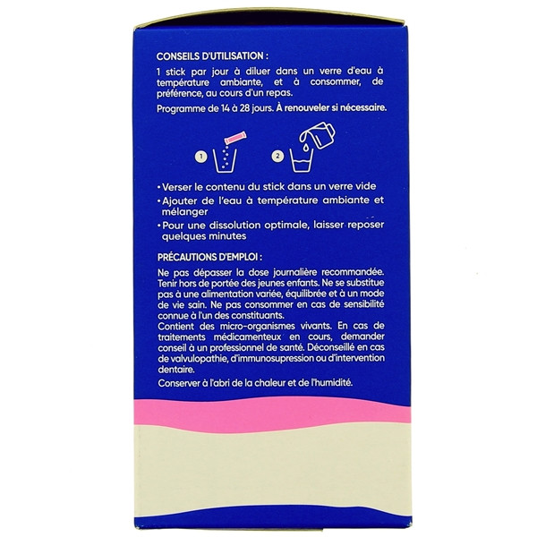 1 stick par jour à diluer dans un verre d'eau à température ambiante, et à consommer de préférence au cours d'un repas. Programme de 14 à 28 jours. À renouveler si nécessaire.