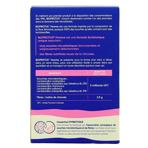 Laboratoires IPRAD Bioprotus Femme 14 Sticks est un complément alimentaire à base de ferments et d'inuline de chicorée. Ce complément alimentaire est une formule inspirée par la composition de la flore féminine, puisque 100% des souches qu'elle contient sont des lactobacilles. Sa formule Symbiotique unique associe :