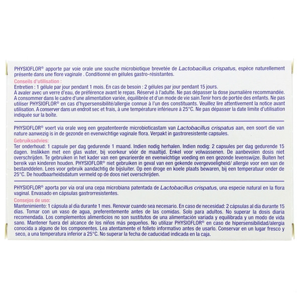 Physioflor LP aide à soulager rapidement l'inconfort et contribue à éliminer les désagréments intimes comme les irritations, démangeaisons, odeurs désagréables et pertes inhabituelles, signes d'un déséquilibre de la flore. Il favorise la restauration et la stabilisation de la flore vaginale en libérant progressivement (LP) 109 Lactobacillus crispatus (souche IP174178 brevetée) à libération. Le pH physiologique est rééquilibré, ce qui contribue à renforcer les mécanismes de défenses physiologiques contre les infections.