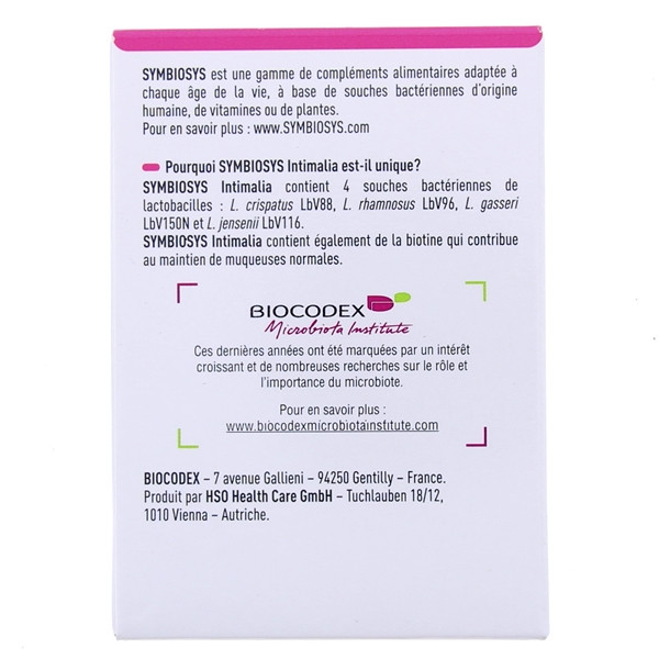 Les gélules Symbiosys Intimalia des laboratoires Biocodex sont des compléments alimentaires conçus pour la femme adulte qui se composent de 4 lactobacilles et de biotine. Ces gélules contribuent au maintien de muqueuses normales.
