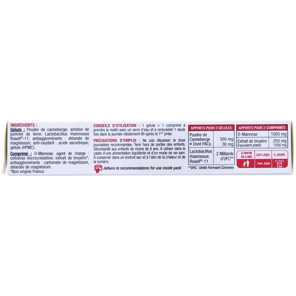 - Gélule : Poudre de canneberge ; Amidon de pomme de terre ; Lactobacillus rhamnosus Rossell®-11 ; antiagglomérants : Stéarate de Magnésium ; Anti-oxydant : acide ascorbique.