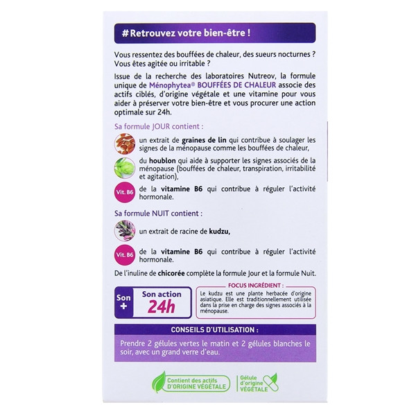 Face aux bouffées de chaleur diurnes et suées nocturnes liées à la préménopause et ménopause chez les femmes de 45 ans et plus, Nutreov vous recommande son complément alimentaire Ménophytéa Équilibre Bouffées de Chaleur.
