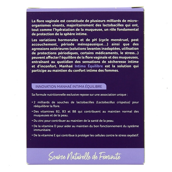 Equilibre intime 30 gelules + 30 capsules intima Manhaé est un complément alimentaire naturel conçu pour maintenir l'équilibre de la flore vaginale. Il est également en mesure de prévenir les déséquilibres qui peuvent causer des infections vaginales.