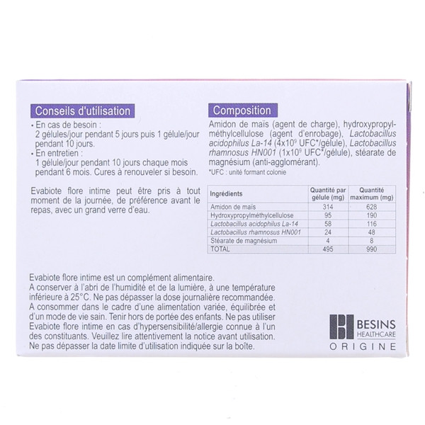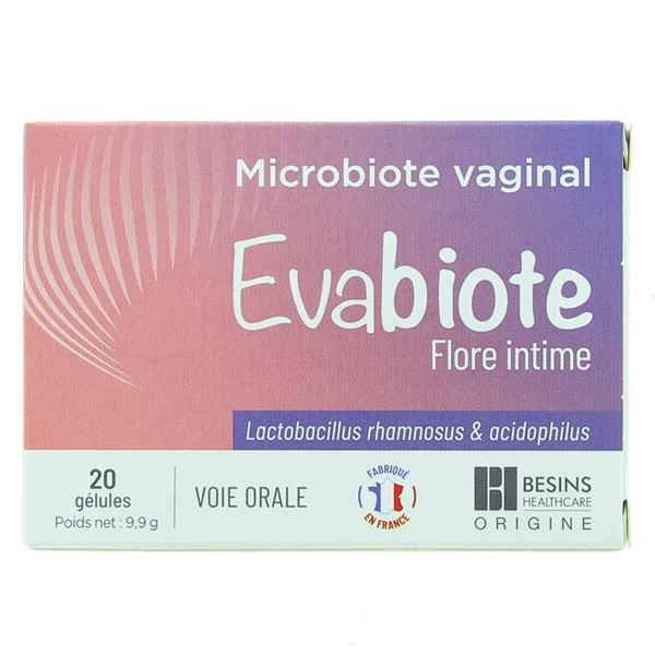 Evabiote Flore Intime est un complément alimentaire par voie orale développé par les laboratoires Besins. Il est formulé à base de probiotiques Lactobacillus rhamnosus et acidophilus. Evabiote Flore Intime est indiqué pour restaurer et préserver le microbiote vaginal.