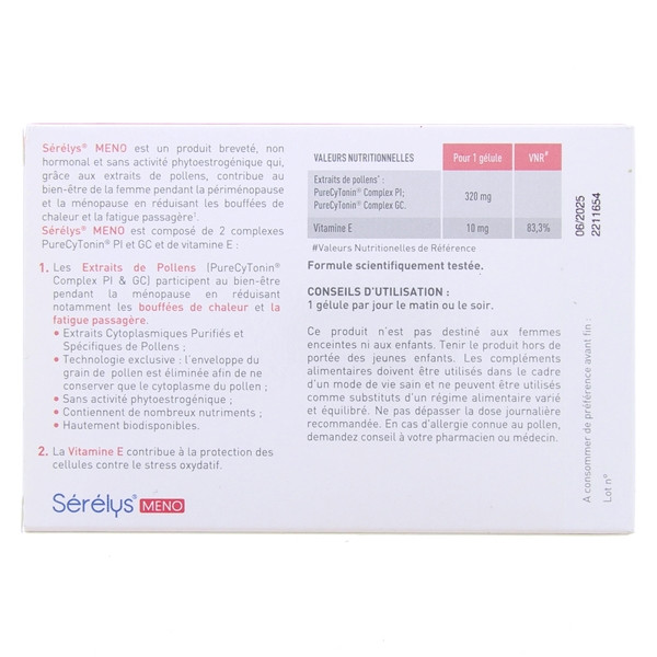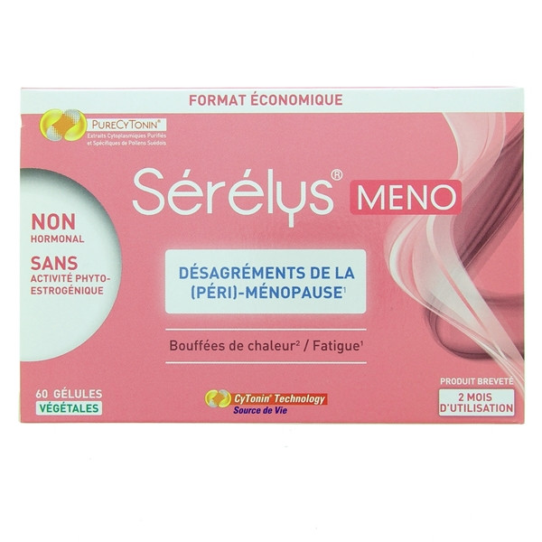 Conditionné sous forme de gélule, le complément alimentaire Sérélys Meno des Laboratoires Sérélys est efficace pour combattre les troubles liés à la pré-ménopause ou à la ménopause. Grâce à ces gélules, réduisez les bouffées de chaleur ou la fatigue passagère.