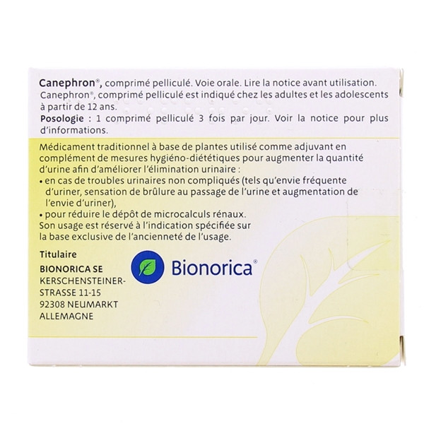 CANEPHRON®, comprimé pelliculé est un médicament traditionnel à base de plantes utilisé comme adjuvant en complément de mesures hygiéno-diététiques pour augmenter la quantité d'urine afin d'améliorer l'élimination urinaire: