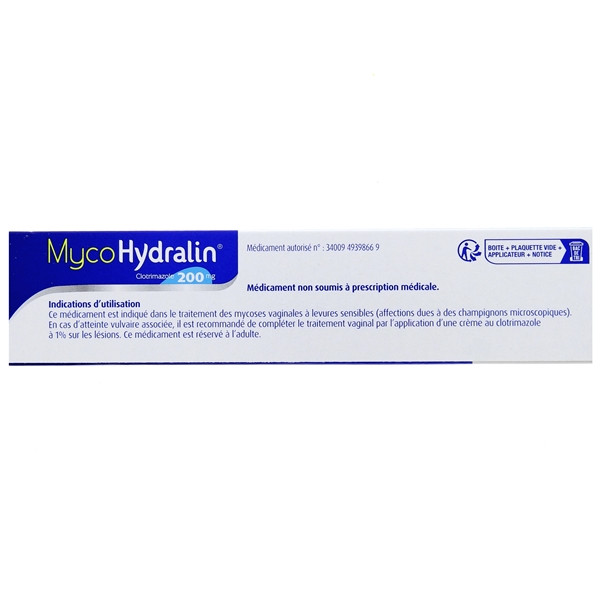MycoHydralin est disponible en boîte de 3 comprimés vaginaux à 200mg de clotrimazole, 1 comprimé/soir pendant 3 jours consécutifs