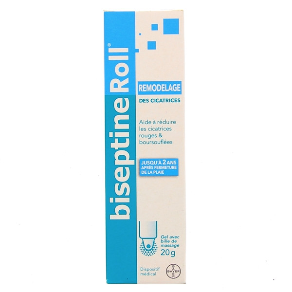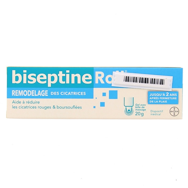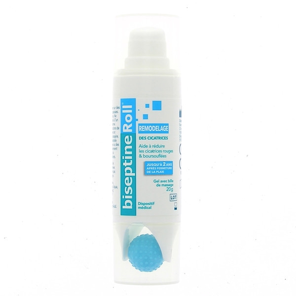 Biseptine Roll est un gel avec bille de massage pour lutter contre les cicatrices. Il peut s'utiliser jusqu’à 2 ans après la fermeture de la plaie. BiseptineRoll est sans parfum, sans conservateur. Il est recommandé pour le remodelage des cicatrices rouges et boursouflées. Biseptine Roll ne s’utilise qu’une fois la plaie complètement fermée