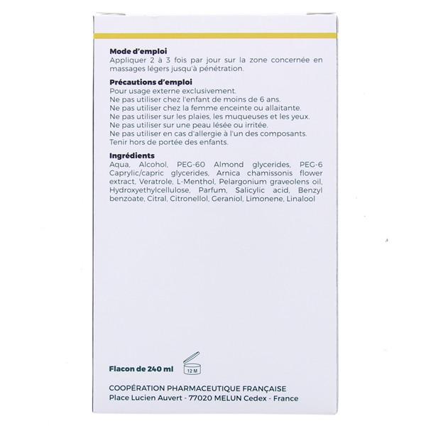 - En cas de choc (coup ou chute) : Appliquer la lotion 2 à 3 fois par jour en massant légèrement jusqu'à pénétration sur la / les partie(s) concernée(s).
