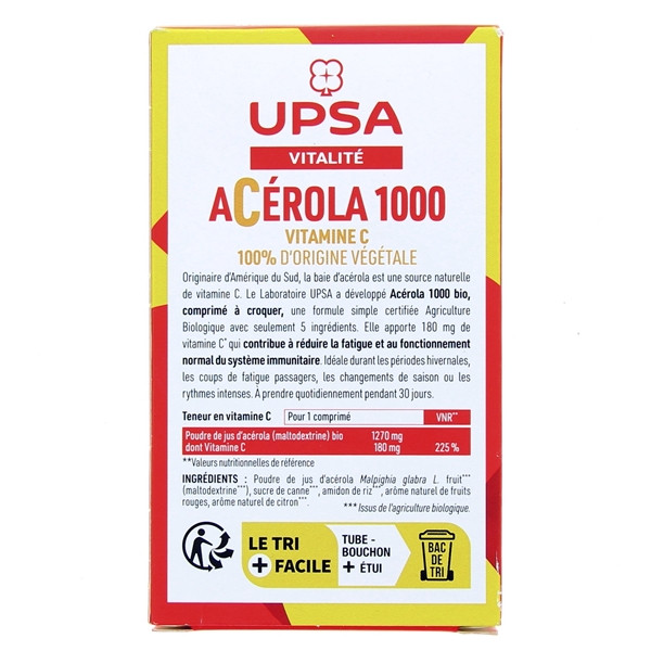 - Pour une utilisation optimale, il est recommandé de prendre 1 comprimé à croquer par jour d’UPSA Vitalité Acérola 1000 Bio.