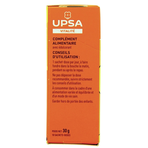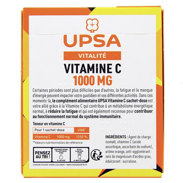 UPSA Vitalité vitamine C 1000 mg est un produit des laboratoires UPSA. Ce complément alimentaire fabriqué en France est présenté sous forme de poudre en sachets et conditionné en 10 sachets dose.