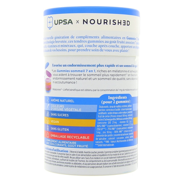 UPSA x Nourished ont développé une nouvelle génération de compléments alimentaires brevetés : Les gummies 7 en 1. Les gummies 7 en 1 Sommeil offrent 7 actions en 1 gomme pour faciliter l'endormissement et retrouver un sommeil de qualité.