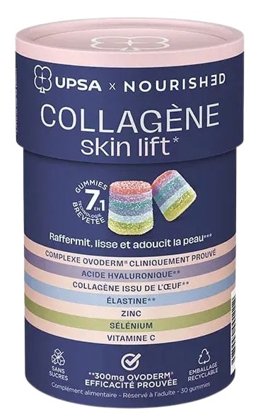 UPSA x Nourished ont développé une toute nouvelle génération de compléments alimentaires brevetés : Les gummies 7 en 1. Les gummies 7 en 1 Collagène Skin Lift offrent 7 actions en 1 gomme pour contribuer à raffermir, lisser et adoucir la peau.