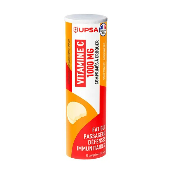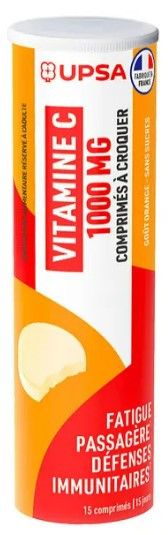 Le complément alimentaire réservé à l'adulte Vitamine C 1000 mg UPSA, en comprimé à croquer au goût d'orange, contribue à réduire la fatigue passagère et au fonctionnement normal du système immunitaire.
