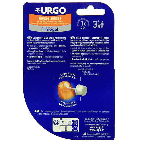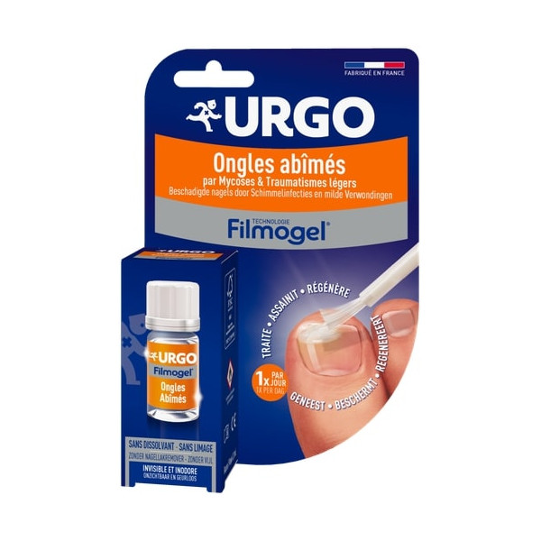 URGO Ongles abîmés est un liquide filmogel® qui forme un film invisible et inodore, indiqué dans le cas d’ongles abîmés par mycoses et traumatismes. Il permet d'assainir, régénérer et protéger l'ongle.