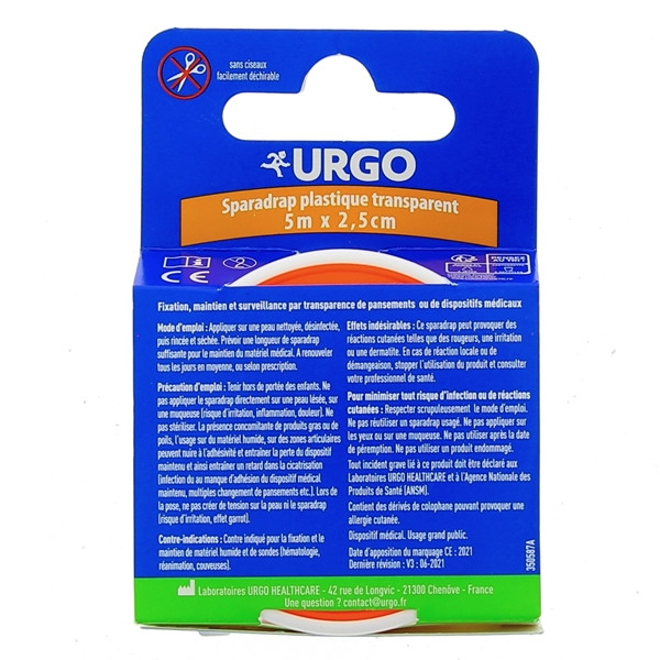 Le sparadrap plastique transparent Urgoplastic s'utilise pour fixer, maintenir et surveiller correctement des pansements ou des dispositifs médicaux. Se déchire facilement, aucun besoin de ciseaux.