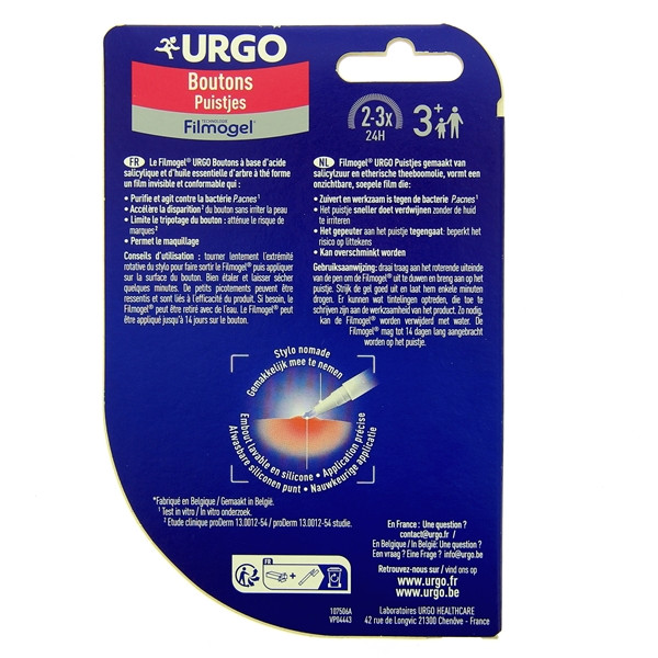 Il est déconseillé de dépasser 6 applications par jour de ce Filmogel Stylo Boutons. Il est destiné à un usage externe uniquement. Ainsi, il est contre indiqué de mettre le filmogel Urgo en contact avec les yeux ou les muqueuses. Ce produit ne doit pas être utilisé chez les personnes allergiques aux dérivés salicylés.