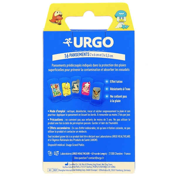 Les Pansements Pokémon Tatoo x16 Urgo ne conviennent pas aux enfants de moins de 3 ans. Il est déconseillé d’utiliser ces dispositifs médicaux des laboratoires Urgo une fois la date de péremption passée. Prenez soin de conserver ces pansements Pokémon Urgo dans un endroit frais et à l’abri de l’humidité.