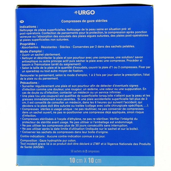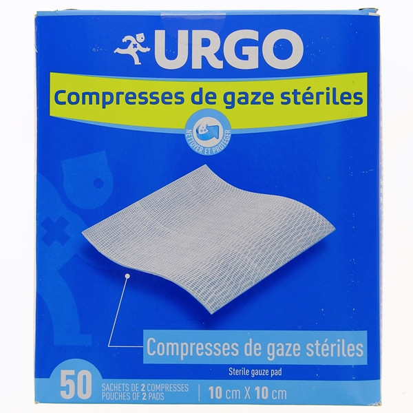 Compresses de gaze stériles 10x10cm x50 des laboratoires Urgo sont indiquées pour nettoyer et protéger les blessures superficielles. Comme elles sont particulièrement absorbantes, elles conviennent également aux lésions exsudatives. Ces dispositifs médicaux sont aussi utilisés par les professionnels de santé pour nettoyer une peau saine avant ou après une opération chirurgicale.