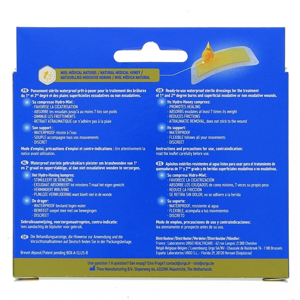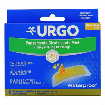 Urgo a développé le pansement stérile cicatrisant pour plaies et brûlures à base de miel médical naturel. Ultra absorbant et waterproof, ce pansement est prêt-à-poser pour soulager et cicatriser les brûlures du 1er et 2d degré et des plaies superficielles exsudatives ou non exsudatives.