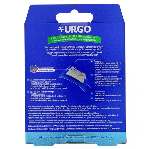 Les pansements Waterproof spécial brûlures et blessures superficielles des Laboratoires Urgo sont conditionnés dans une boîte de 4 pansements grand modèle. Grâce à sa technologie Lipido-Colloïde, ce pansement est préconisé pour calmer la douleur, tout en cicatrisant une brûlure ménagère du 1er degré, une brûlure superficielle du second degré ou une blessure superficielle.