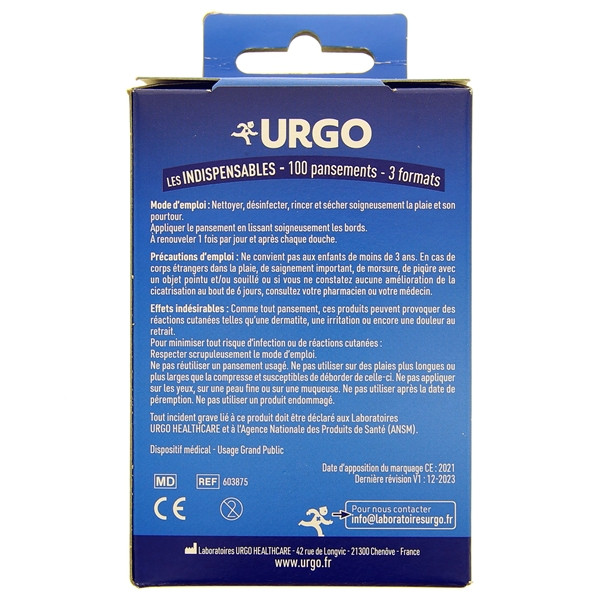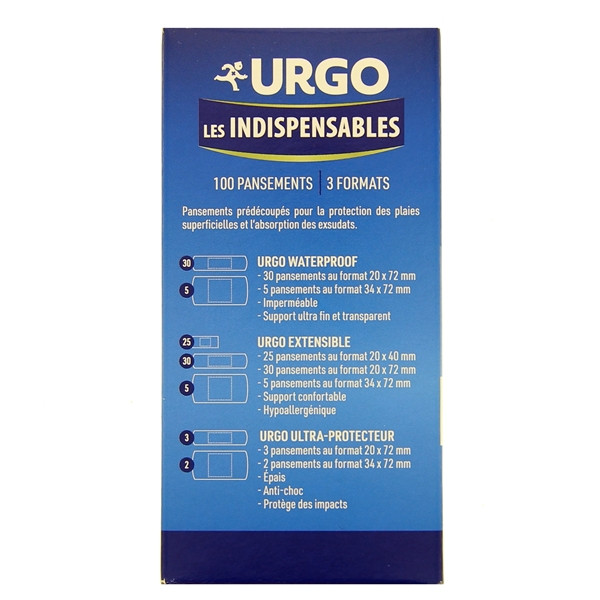 Disponible en boîte de 100 pansements avec 3 formats et 3 Supports (Urgo Waterproof, Urgo Extensible et Urgo Ultra-Protecteur).