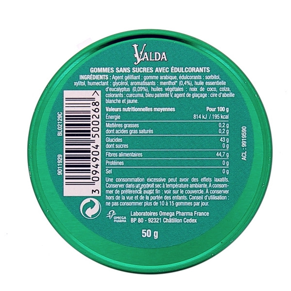 Les gommes Valda goût menthe eucalyptus sont sans sucres. Elles permettent d'adoucir la gorge lors d'irritations pouvant être causées par des quintes de toux ou des maux de gorge.