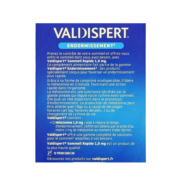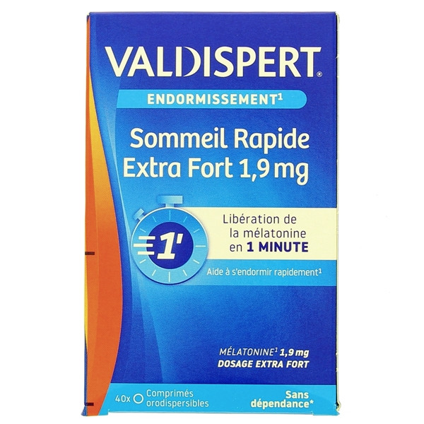 Valdispert Sommeil Rapide Extra Fort 1,9 mg est un complément alimentaire sous forme de comprimés à faire fondre sur la langue. Il se prend sans eau, 15 minutes avant le coucher. Ce supplément est à prendre dans le cadre d’une alimentation variée, équilibrée et d’un mode de vie sain.