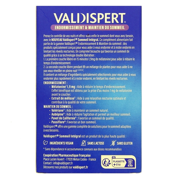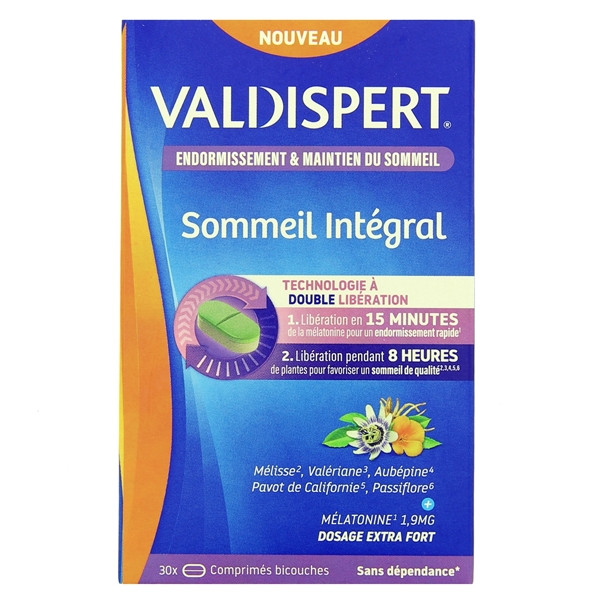 Valdispert Sommeil Intégral est un complément alimentaire en comprimé bicouche formulé à base d'une technologie à double libération. Une libération en 15 minutes de la mélatonine pour un endormissement rapide et une pendant 8 h de plantes pour favoriser un sommeil de qualité.