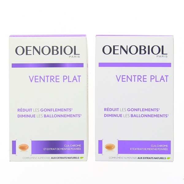 Le complément alimentaire Oenobiol Ventre plat contient du CLA (Acide Linoléique Conjugué), du chrome et un extrait de menthe poivrée qui aide à réduire les gonflements et ballonnements indésirables pour un ventre plus plat.