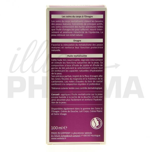 Les laboratoires Weleda ont élaboré pour les peaux matures l'huile revitalisante à l'Onagre Weleda. Sa formule enrichie en huile de Jojoba et de germe écarte les risques de relâchement de l'épiderme, restructure la peau pour activer la régénération cellulaire. Grâce à sa forte teneur en acide gras essentiel, l'huile revitalisante à l'Onagre Weleda favorise l'hydratation naturelle de la peau. L'huile d'Onagre bio raffermit et nourrit la peau en profondeur. Elle retrouve toute son élasticité. Son parfum allie la douceur de la cardamome et la sensualité du magnolia.