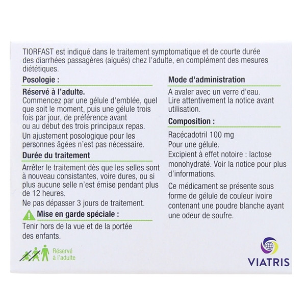 Tiorfast 100 mg Viatris est indiqué dans le traitement symptomatique et de courte durée de la diarrhée passagère (aiguë) chez l'adulte.