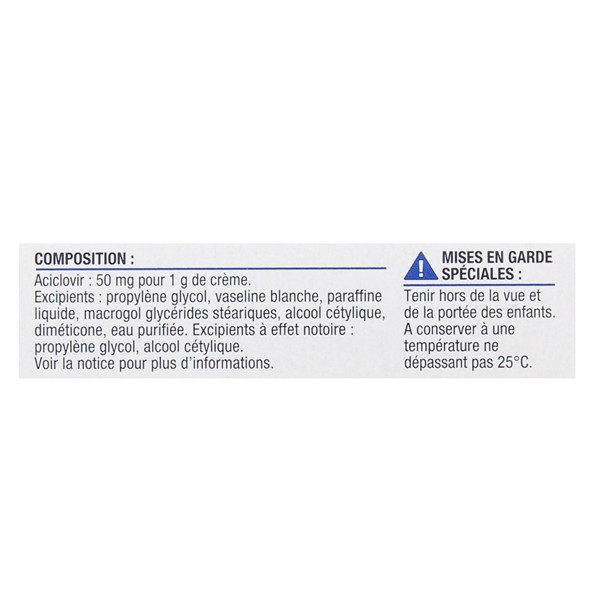 Cette crème disponible sans ordonnance est destinée à être utilisée sur les conseils de votre pharmacien ; signalez-lui tout antécédent de réaction allergique à un médicament contenant de l'aciclovir ou du valaciclovir. Ne l'utilisez pas pour des lésions herpétiques situées ailleurs que sur les lèvres.