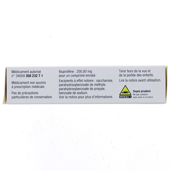 Disponible en boîte de 30 comprimés enrobés de 200 mg d'ibuprofène.