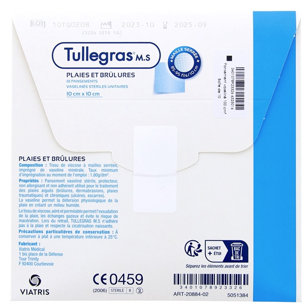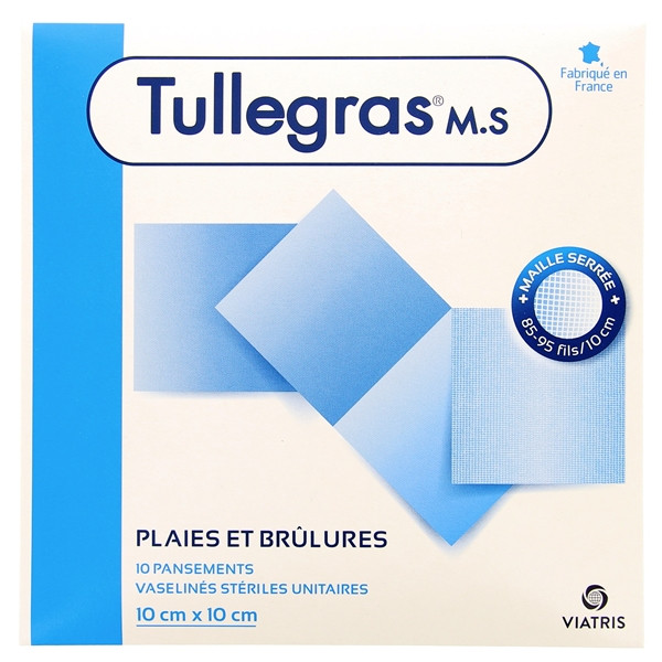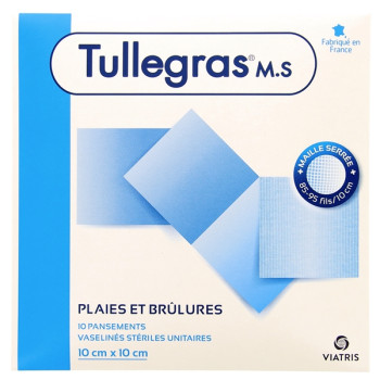 Tullegras M.S. Pansements Vaselinés Sétériles est disponible en boîte de 10 pansements de 10 cm x 10 cm.