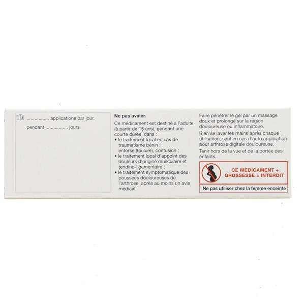 Ce gel peut être irritant pour les yeux ou les muqueuses : lavez-vous les mains après l'application (sauf en cas d'utilisation pour l'arthrose des doigts). En cas de contact accidentel avec les yeux, rincez abondamment.