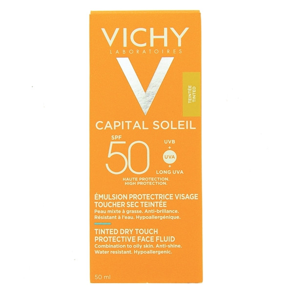 Le soin solaire Capital Soleil Émulsion Protectrice Visage Teintée au toucher sec SPF50 de la marque Vichy est idéal pour les peaux mixtes à grasse. Grâce à ses composants actifs, elle contribue à protéger la peau contre les effets néfastes d'une exposition au soleil tout en apportant une action anti-brillance.