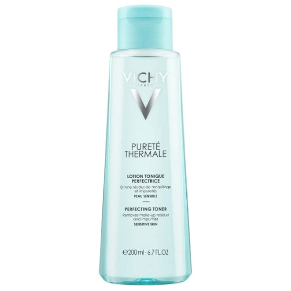 Pureté Thermale Lotion Tonique Perfectrice des laboratoires Vichy élimine résidus de maquillage et impuretés. Cette eau tonique prend soin des peaux sensibles.