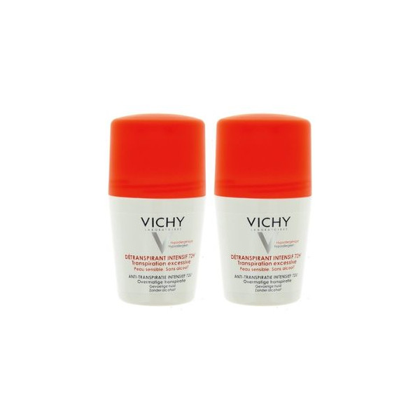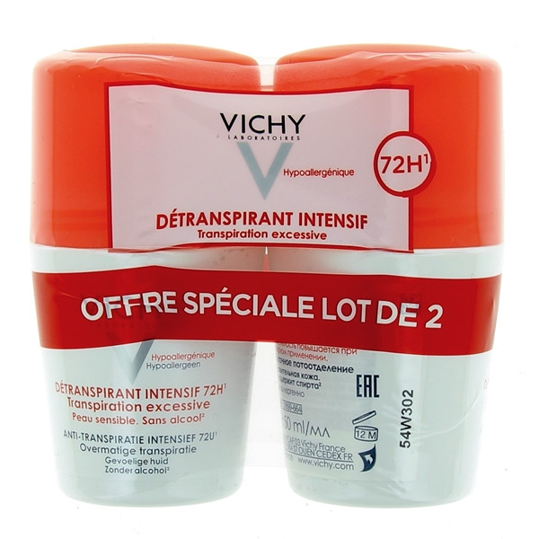 Le Détranspirant Intensif proposé par les laboratoires Vichy est indiqué pour lutter de manière efficace contre la transpiration excessive. Grâce à l'action absorbante d'actifs anti-transpirant très performants associés au perspicalm et à des minéraux ultra-absorbants, il régule parfaitement les pics de transpiration et l'afflux de chaleur même dans une situation de stress. Il respecte les peaux sensibles et garantit une haute tolérance. Il dispose d'une formulation dépourvue d'alcool et de paraben. Il procure une protection de longue durée et reste fonctionnel pendant 72 heures.