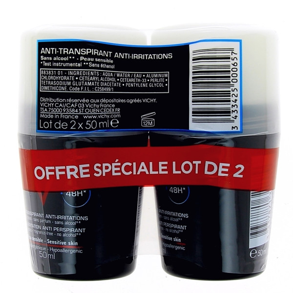 L'anti-transpirant & Anti-irritations pour homme proposé par les laboratoires Vichy est idéal pour lutter contre la transpiration des peaux sensibles. Bénéficiant d'actifs anti-transpirants performants, il permet de réguler normalement la transpiration. Grâce aux propriétés apaisantes de l'oligo-Zinc, il apaise intensément les peaux sensibles. Il offre instantanément une sensation de fraîcheur à son utilisateur. Formulé sans parfum et sans alcool, il respecte la sensibilité de la peau en garantissant une très haute tolérance. Il a l'avantage de ne pas laisser de traces.
