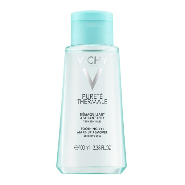 Eau démaquillante apaisante, de la gamme Pureté Thermale du laboratoire Vichy, adaptée aux yeux sensibles et aux porteurs de lentilles de contact. Cette lotion démaquille en douceur les cils et les paupières et apaise le contour de l'œil.