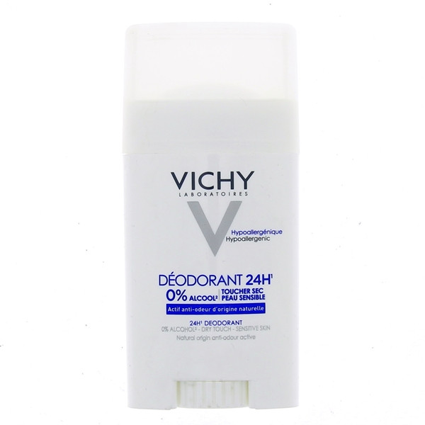Ce déodorant stick hypoallergénique est idéal pour les peaux réactives, fragiles et très sensibles, grâce à ses vertus apaisantes et hydratantes. Il convient aussi aux peaux irritées à la suite d’un rasage ou d’une épilation. Il ne contient pas d’alcool ou de parabène. Le déodorant Stick 24 h au fini toucher sec 40ml de Vichy offre instantanément du confort et de la douceur, sans laisser aucune tache blanche.