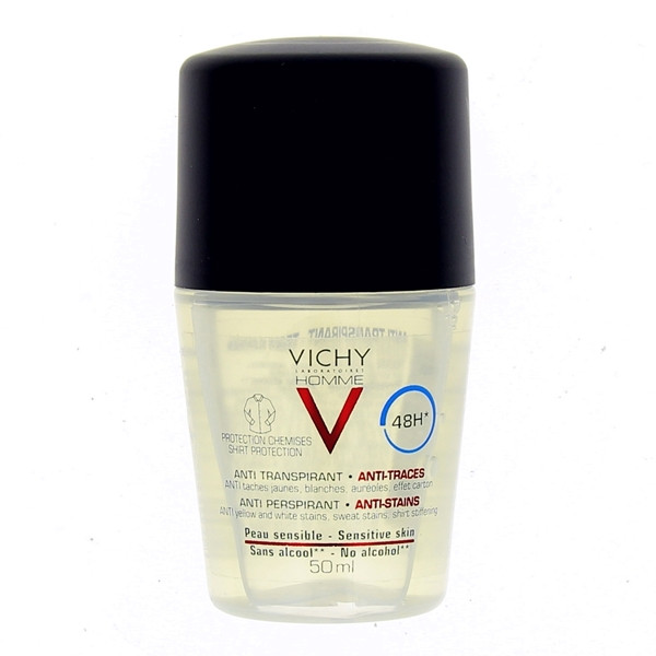 Vichy a créé pour les hommes, qui recherchent une efficacité déodorante et anti-transpirante très longue durée (48 h), une protection unique anti-taches jaunes, blanches, auréoles, et sans effet carton. Convient aux peaux sensibles.
