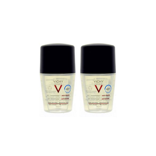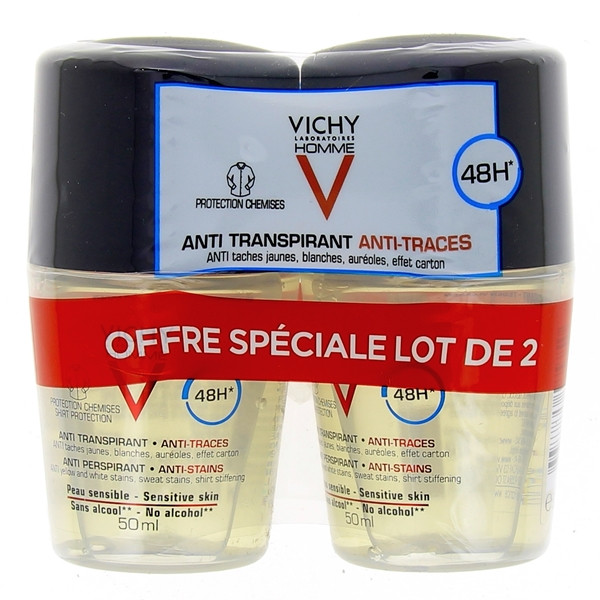 L'anti-transpirant à bille et anti-trace de Vichy pour les hommes a été créé pour offrir une efficacité déodorante et anti-transpirante jusqu'à 48 h et une protection unique anti-taches jaunes, blanches et auréoles, sans effet carton.