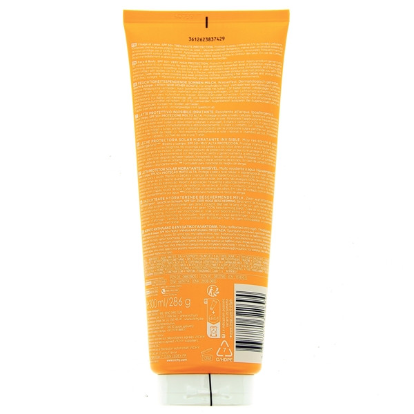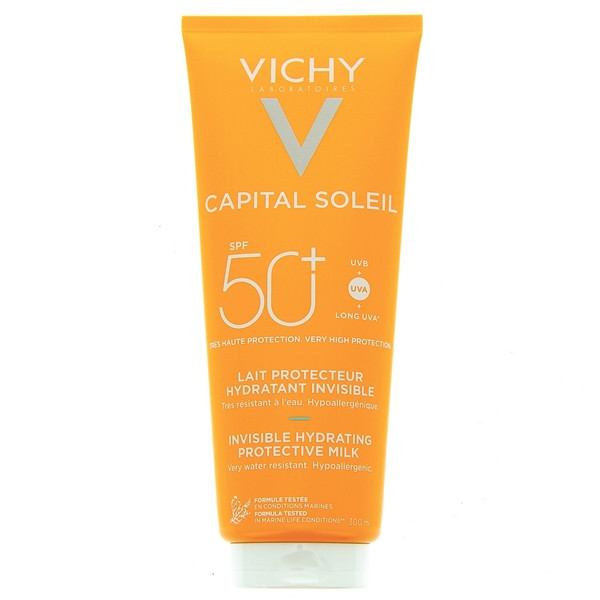 Capital Soleil Lait Protecteur Hydratant Invisible SPF50+ de Vichy offre une très haute protection solaire grâce à son SPF50+. Il hydrate en profondeur la peau du visage et du corps. Hypoallergénique, il convient aux peaux sensibles.