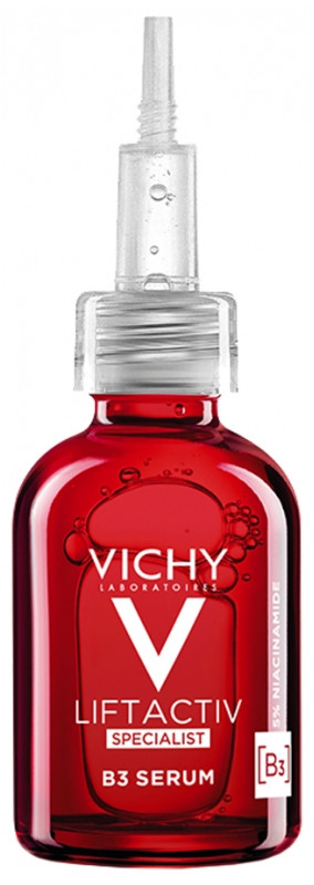 Vichy Sérum Liftactiv Specialist B3 apporte une aide précieuse pour combattre les premiers signes de l’âge grâce à ses actions efficaces sur les rides et les taches brunes. Ce soin est formulé à base d’eau thermale volcanique de Vichy connue pour ses propriétés revitalisantes et apaisantes pour la peau. À ce principal ingrédient s’ajoutent d’autres composants aux différentes vertus bénéfiques pour la peau : la vitamine B3 (niacinamide), la vitamine Cg, l’acide glycolique et le peptide collagen specialist, une exclusivité des laboratoires Vichy. Au final, les rides sont durablement comblées et les marques de dyschromie sont sensiblement réduites. D’une texture légère, ce sérum pénètre rapidement dans la peau.