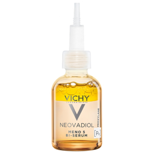 Neovadiol Meno 5 Bi-Serum des laboratoires Vichy est un produit anti-âge formulé pour les peaux matures. Il est principalement destiné pour les femmes en phase de péri-ménopause. Il agit surtout sur les effets négatifs de la ménopause, dont le déséquilibre hormonal. Ce phénomène va entraîner la perte de densité de l’épiderme, l’apparition des taches brunes, un manque d’éclat et la sécheresse cutanée.
