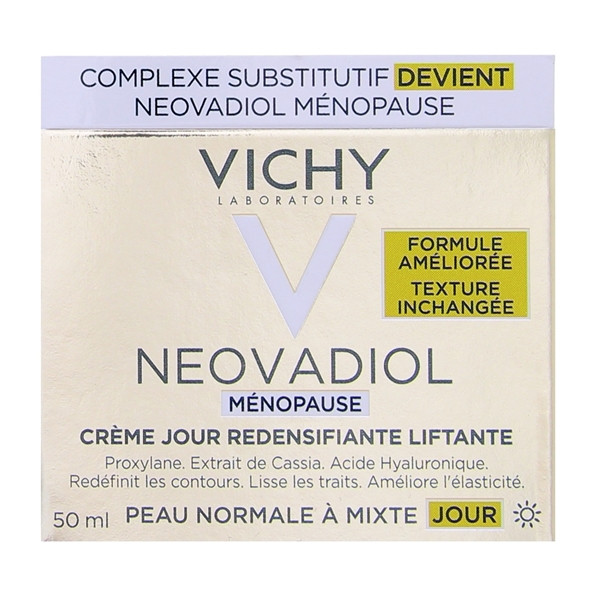 Neovadiol Ménopause Crème de Jour Peau Normale à Mixte des laboratoires Vichy est un soin anti-âge redensifiant et liftant qui agit sur les effets de la ménopause sur la peau. Cette crème redéfinit les contours du visage, lisse les traits et améliore l'élasticité.